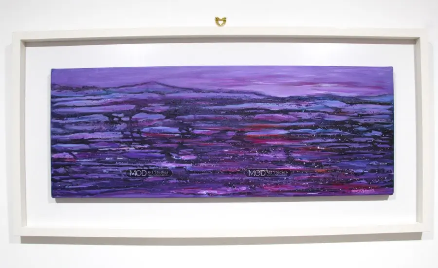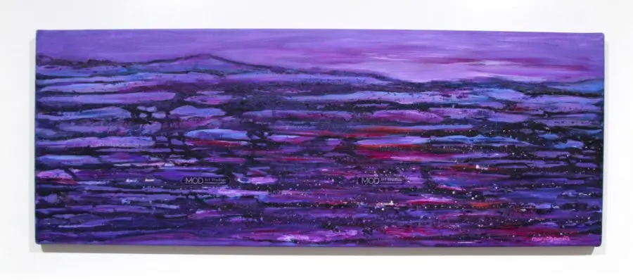 Artist’s Note: This colourful landscape was inspired by my love of The Burren National Park in the West of Ireland. The painting is of the layers of rock on the limestone mountain range in The Burren I love watching the changing light of the day on the mountain range from my art studio, and often in Summer, the mountains glow in pink and purple hues for an hour after the sun sets.