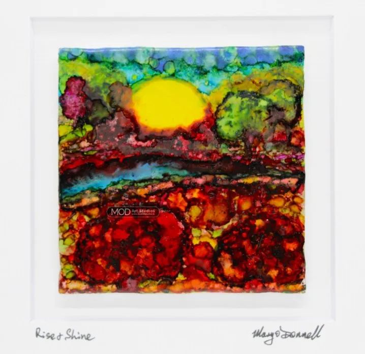 Colourful Art for Home & Gift. Individual hand painted ink paintings on ceramic with quality mounts and frames. These bespoke pieces are displayed on acid free mounts and backing boards, in Irish made, white, wood box frames with glass. Delivered Ready to Hang.